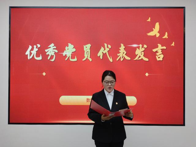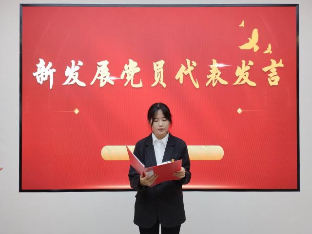 新发展党员代表李婕同志进行了发言,从三个方面表达了对党的深厚感情和为党的事业奋斗终身的坚定决心。一是坚定信念,永远跟党走;二是学习先进,提升自我;三是勇于担当,贡献力量。