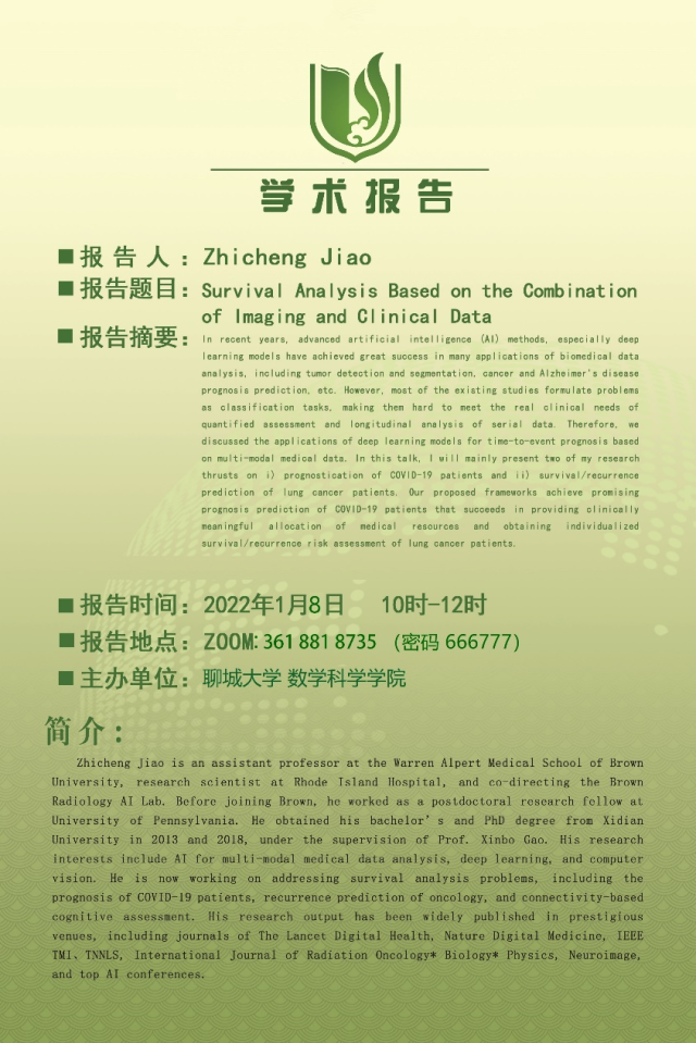 2022年1月8日上午10时,布朗大学焦志成博士应邀与我院师生开展线上学术交流,并就“基于成像及诊疗数据的预后分析“进行学术报告。学院研究生与教师总计30余人参加。焦志成博士的告引起师生们的热烈反响与好评。