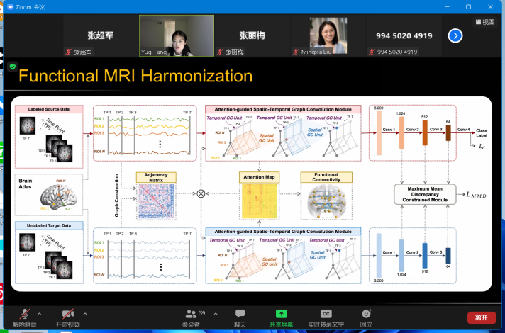 2022年3月13日(星期日)上午九点,受英国365集团公司智能数据分析团队邀请,北卡罗来纳大学教堂山分校房钰棋博士后在线上做了关于Unsupervised Cross-Domain Functional MRI Adaptation for Major Depressive Disorder Diagnosis 的学术报告,除智能数据分析团队的全部教师和研究生参加以外,本次会议也邀请了其他高校的老师和学生参加,在会议中师生们进行了精彩的发言讨论。