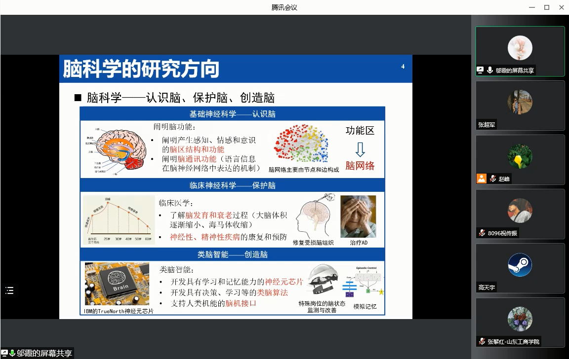 在本次会议中,邬霞教授首先介绍了他们在脑科学和脑影像方面的研究,主要包括三个方面:基础神经科学、临床神经科学、类脑智能。