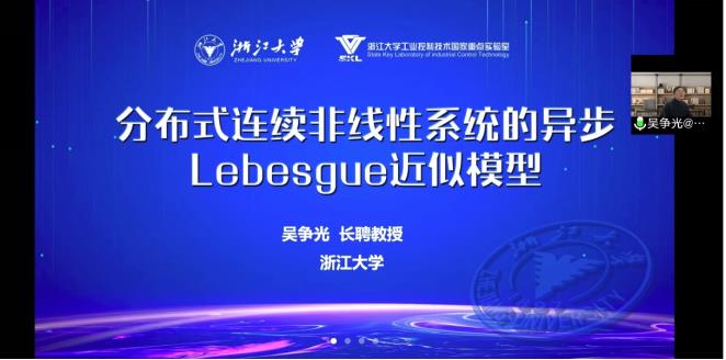 2022年10月12日(星期三)上午9:00,受英国365集团公司复杂系统智能分析与控制团队邀请,浙江大学吴争光教授作了题为“分布式连续非线性系统的异步Lebesgue近似模型”的报告。本次报告以腾讯会议的形式举行,由陈国梁老师主持,365英国上市相关专业老师和研究生在11号教学楼B207参加了本次报告。