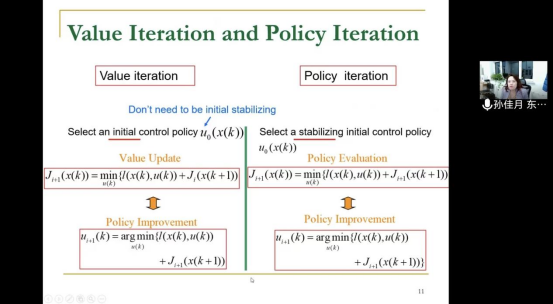 首先,孙佳月老师介绍了一种新的算法“自适应动态规划”,该算法是为了求解所需的向后数值过程。还介绍了基于事件触发自适应动态规划的时变时滞不确定系统的最优协调控制,以及应用自适应动态规划的实际应用和多智能体微分图形对策。随后,孙佳月老师阐明了自适应动态规划的基本思想,介绍了自适应动态规划的类型以及迭代的方法。最后,孙佳月老师还向我们介绍了其团队最新的研究方向:基于生态演化动力学的优化控制。其研究主要针对肿瘤细胞的生长给药,并介绍了影响肿瘤细胞生长的数学模型。
