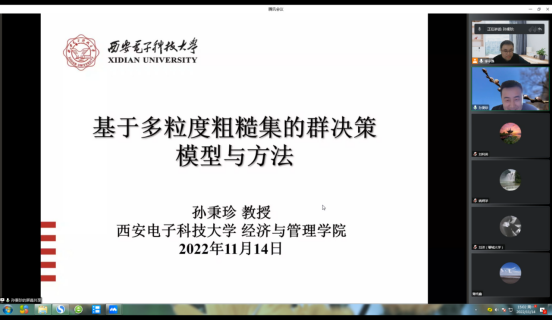 2022年11日14日,受365英国上市邀请,西安电子科技大学孙秉珍教授在线上作了题为“基于多粒度粗糙集的群决策模型与方法”的学术报告。此次报告由365英国上市李令强教授主持,不确定理论团队相关专业老师和研究生参加了本次报告会。