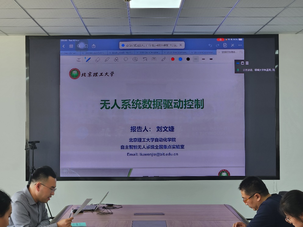 在此次报告中,刘文婕博士首先从数据驱动的角度,考虑未知无人系统在控制中面临的常见问题。随后,介绍了目前子空间类型的数据驱动控制方法,提出了关于拒绝服务攻击下的数据驱动弹性控制,基于轨迹预测的数据驱动自触发控制和基于噪声数据的鲁棒LQG控制器设计的研究成果。仅利用收集到的小样本噪声数据,实现对无人系统弹性、自触发控制以及鲁棒状态估计。会后,参会老师和研究生分别提出相关问题,刘文婕博士做出了详细解答,并进行了深入交流。