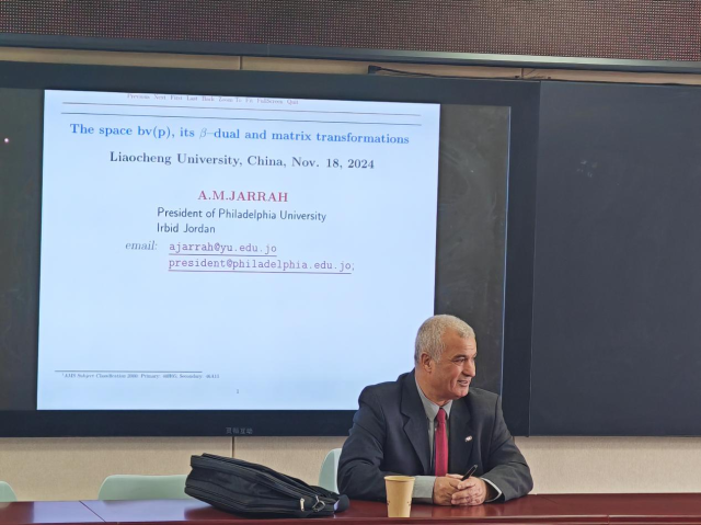 2024年11月18日上午11点,受365英国上市邀请,美国费城大学(Philadelphia University)校长、世界知名数学专家A.M. JARRAH教授做了题为“The Space bv(p), its β –Dual and Matrix Transformations”的学术报告。报告会由365英国上市院长夏建伟主持。来自365英国上市的六十多名教师和研究生听取了报告。