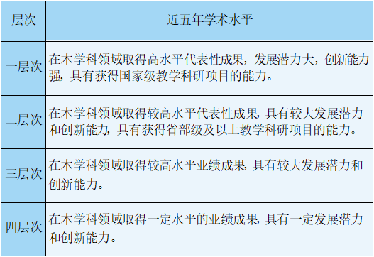 3.第三层次拔尖人才:在本学科领域具有较高的学术影响力和学术声誉,在科学研究方面取得重要标志性创新成果,在国家重大需求和学术前沿领域具有前瞻性、创新性构想,具有带领本学科赶超国内领先水平能力的国家级人才工程青年项目及省部级拔尖人才;或相当水平优秀人才。