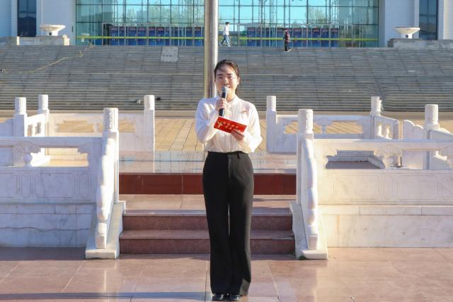 上午7时,英姿飒爽的国旗护卫队迈着铿锵有力的步伐,以昂扬的姿态护送鲜艳的五星红旗走向升旗台,伴随着激昂的《义勇军进行曲》,五星红旗缓缓升起,全体师生面向国旗行注目礼。