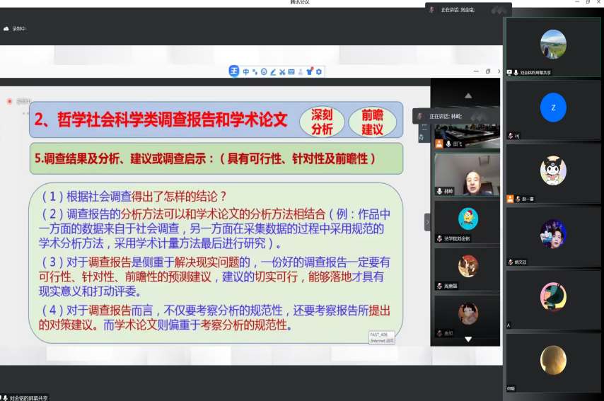 本次宣讲会分为挑战杯赛事介绍、项目开展历程、参赛经验分享三个环节。刘金铭向同学们介绍了“大挑”的作品分类及其评审侧重点,并着重介绍哲学社会科学类社会调查报告和学术论文的要求。项目选题应将自己的专业知识与社会发展要求相结合,在参赛过程中发挥每个成员的长处,增强团队合作意识。最后,她鼓励同学们放下思想包袱,勇于尝试,积极参加科创竞赛,增长才干,练就创新本领。