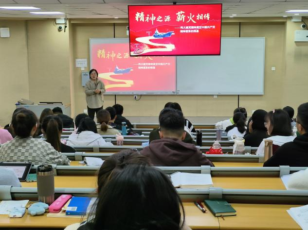 张昕丽以“中国共产党的精神之源——伟大建党精神”为切入点,通过实例带领大家学习了建党精神的内涵,并鼓励同学们要从党的百年伟大历程中汲取深厚的养分和力量,把伟大建党精神继承下去、发扬光大。