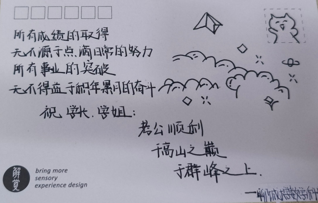 同学们以“情系学子,温暖考途”为主题,通过赠送助力贺卡和上传祝福视频两种方式,为考研、考公、考编的学长学姐们加油打气。贺卡图文搭配得当,画面新颖温馨,内容充实切题,情感表达真挚;助力视频中一句句暖心祝福给予了备考中的学长学姐们最真诚、最温暖的鼓励,传递了学弟学妹们最热切、最诚恳的祝愿。