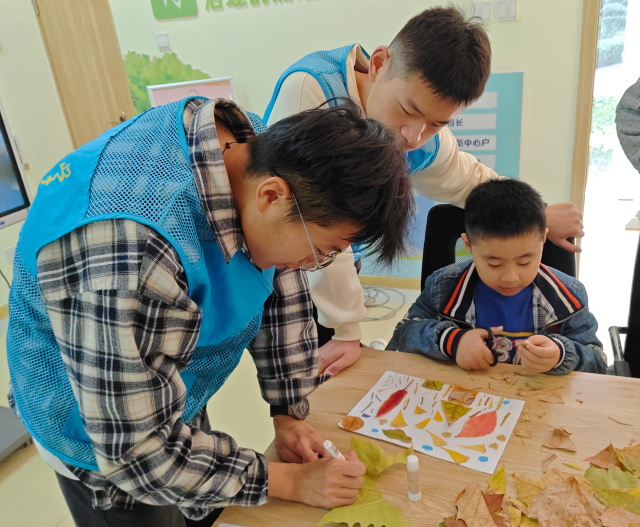 本次活动主要包括讲解秋韵含义、欣赏树叶以及落叶创作三方面。活动伊始,志愿者通过PPT生动讲解了观察树叶形状、颜色和纹理的方法,分享了巧妙组合树叶等自然元素以呈现秋韵的技巧,小朋友们全神贯注地聆听,眼中流露出对美丽树叶的喜爱和对秋韵的向往。随后,志愿者引领小朋友走进户外,挑选出自己最喜欢的树叶进行采集,让孩子们与大自然亲密接触,感受秋天的气息。活动最后,志愿者和小朋友一起回到室内进行落叶创作,他们耐心地向小朋友演示落叶作品的制作步骤,悉心指导,孩子们通过自己的双手,将一片片色彩斑斓的树叶拼凑成心中最美的画面,每一个作品都承载着他们对秋天独特的理解和对生活的热爱。