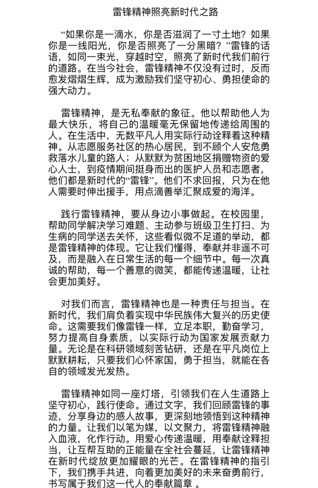 此次征文活动以文字凝聚力量,加深学生对雷锋精神的理解,增强学生社会责任感,营造学院互帮互助、积极向上的良好氛围。展望未来,学院将继续以实际行动书写新时代的雷锋故事,让雷锋精神化作温暖人心的行动。