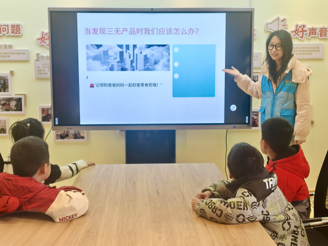 活动伊始,志愿者精心播放了一段与消费主题相关的短片,生动再现了小朋友购买零食等日常场景,迅速吸引了在场孩子们的注意力,为后续教学营造了轻松愉悦的氛围。随后,志愿者通过PPT讲解基础消费知识,深入浅出地介绍如何查看商品的生产日期和保质期,并巧妙设计互动提问,如“如果发现零食过期了该怎么办?”,激发孩子们的思考与积极参与。