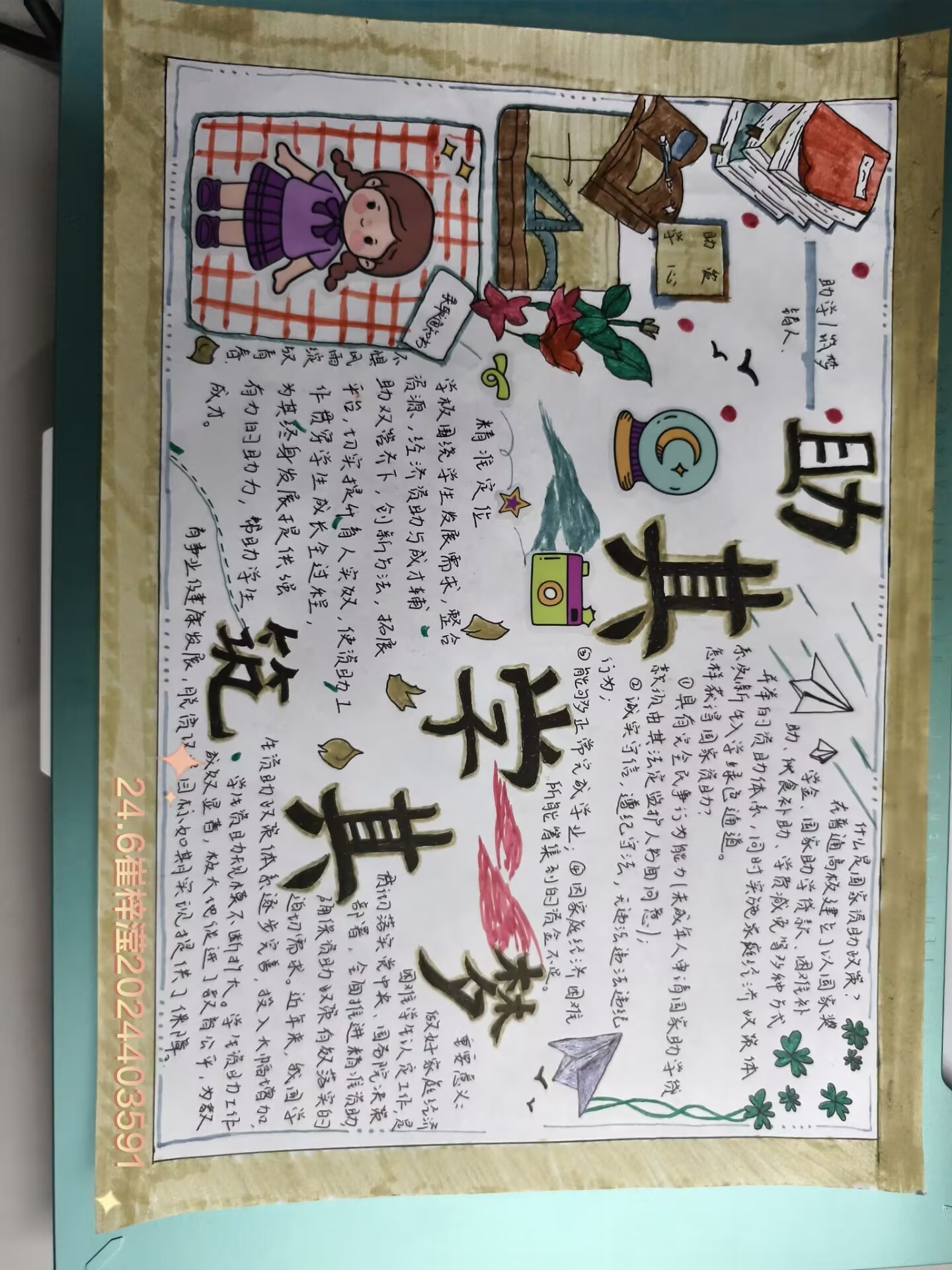 为增进同学们对资助政策的了解,激发他们的学习动力与追梦热情,12月2日到12月6日,365英国上市勤工助学中心于线上举办“助其学,筑其梦”手抄报活动,2021级、2024级部分学生参加。