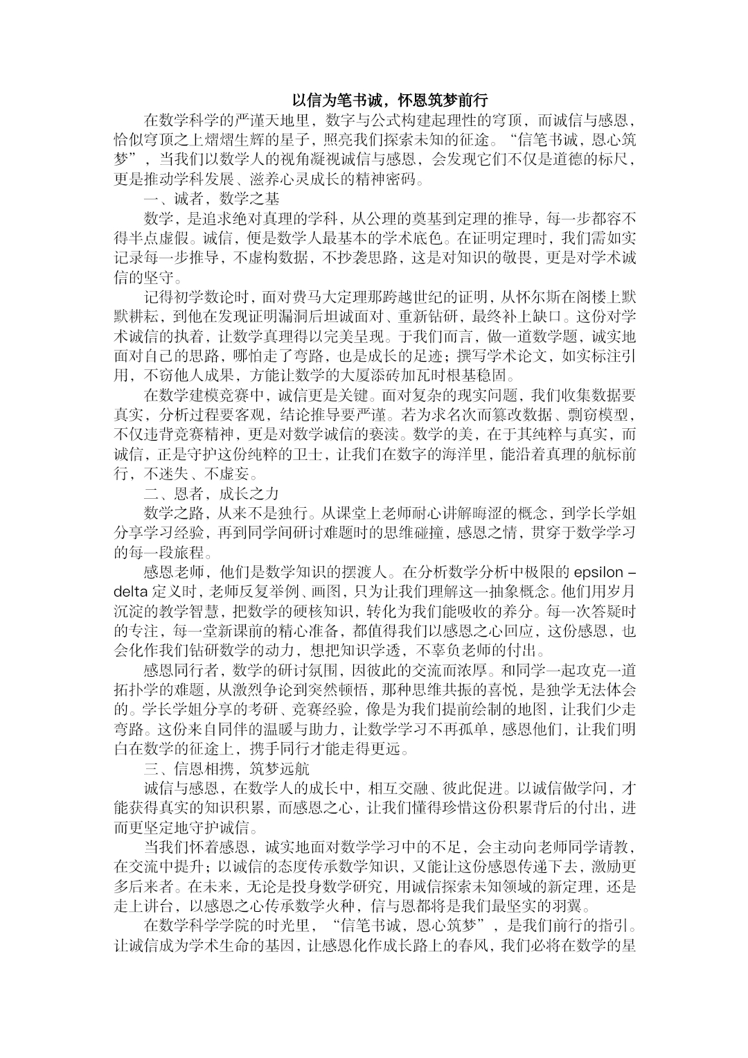 信笔书诚扬美德,恩心筑梦润芳华。此次活动以征文为媒介,让学生主动思考如何在学习生活中将诚信与感恩付诸于行动,不仅锻炼了学生的文字表达与创作能力,还提升了学生的诚信与感恩意识,有助于营造浓厚的校园诚信感恩文化氛围。