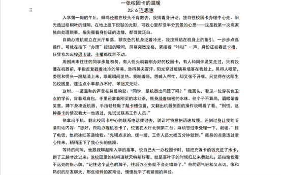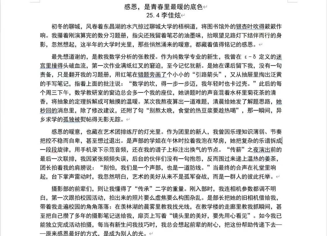 本次活动聚焦“感恩”核心主题,以文字传情、以心声寄暖。活动过程中,同学们以真挚笔触定格校园生活里的温情瞬间,细致捕捉日常点滴中的感动瞬间。无论是师生间的悉心教诲、同窗间的互助扶持,亦或是家人的默默守护与坚定支持,大家从多元视角探寻感恩真谛,深刻领悟感恩内涵,笔下流淌真心、字间满含赤诚,撰写出多篇立意鲜活、情感真挚的佳作,传递了温暖正能量,让感恩之心扎根心底,凝聚成向善向暖的成长力量。