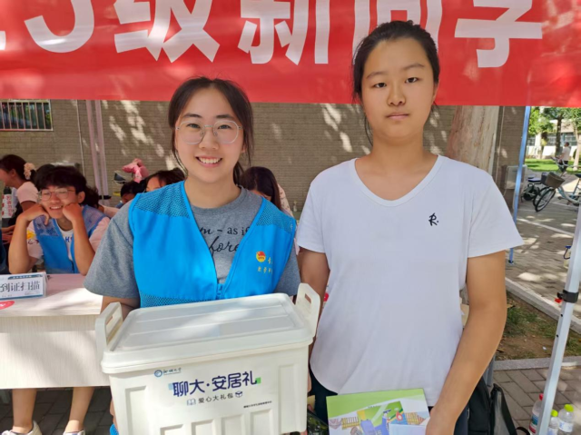 尤为暖心的是,针对通过绿色通道入学的家庭经济困难新生,志愿服务团队还为同学们颁发了聊大安居礼包。这份礼包里包含了洗漱用品、台灯、收纳箱、手机支架等生活学习必需品。志愿者们在新生完成报到手续后,亲手将安居礼送到他们手中,还细致地叮嘱新生:“有任何生活或学习上的困难,随时可以找学院的学长学姐或者辅导员。”收到礼包的新生们脸上洋溢着感动的笑容。