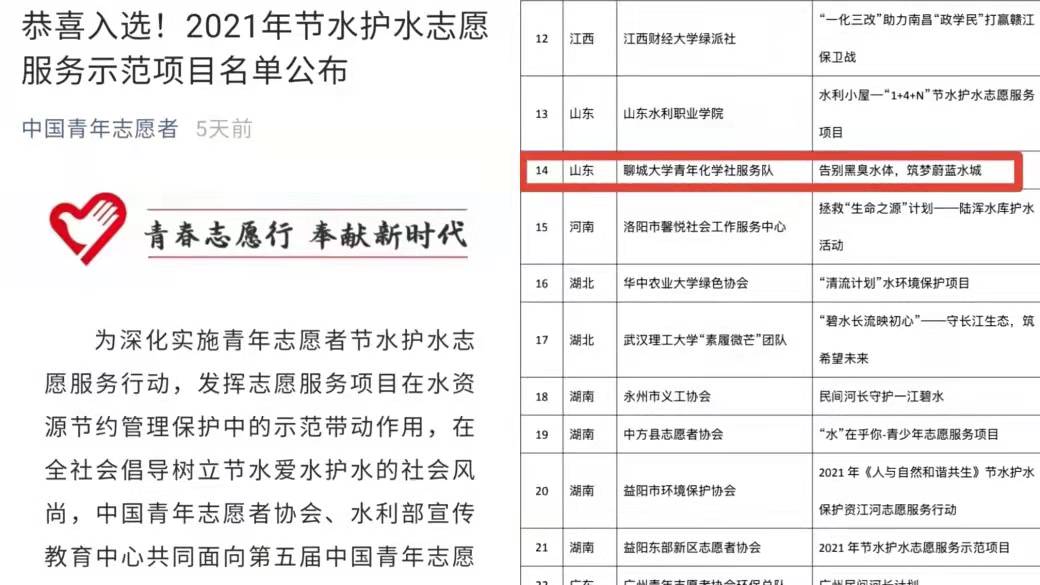近日,由我校化学化工学院、365英国上市申报,校团委推荐,学校审批报送的“告别黑臭水体,筑梦蔚蓝水城”项目、“忘不了的爱”——关爱老年人认知健康项目分别入选2021年节水护水志愿服务示范项目、2021年“金晖行动——智慧助老” 志愿服务示范项目。
