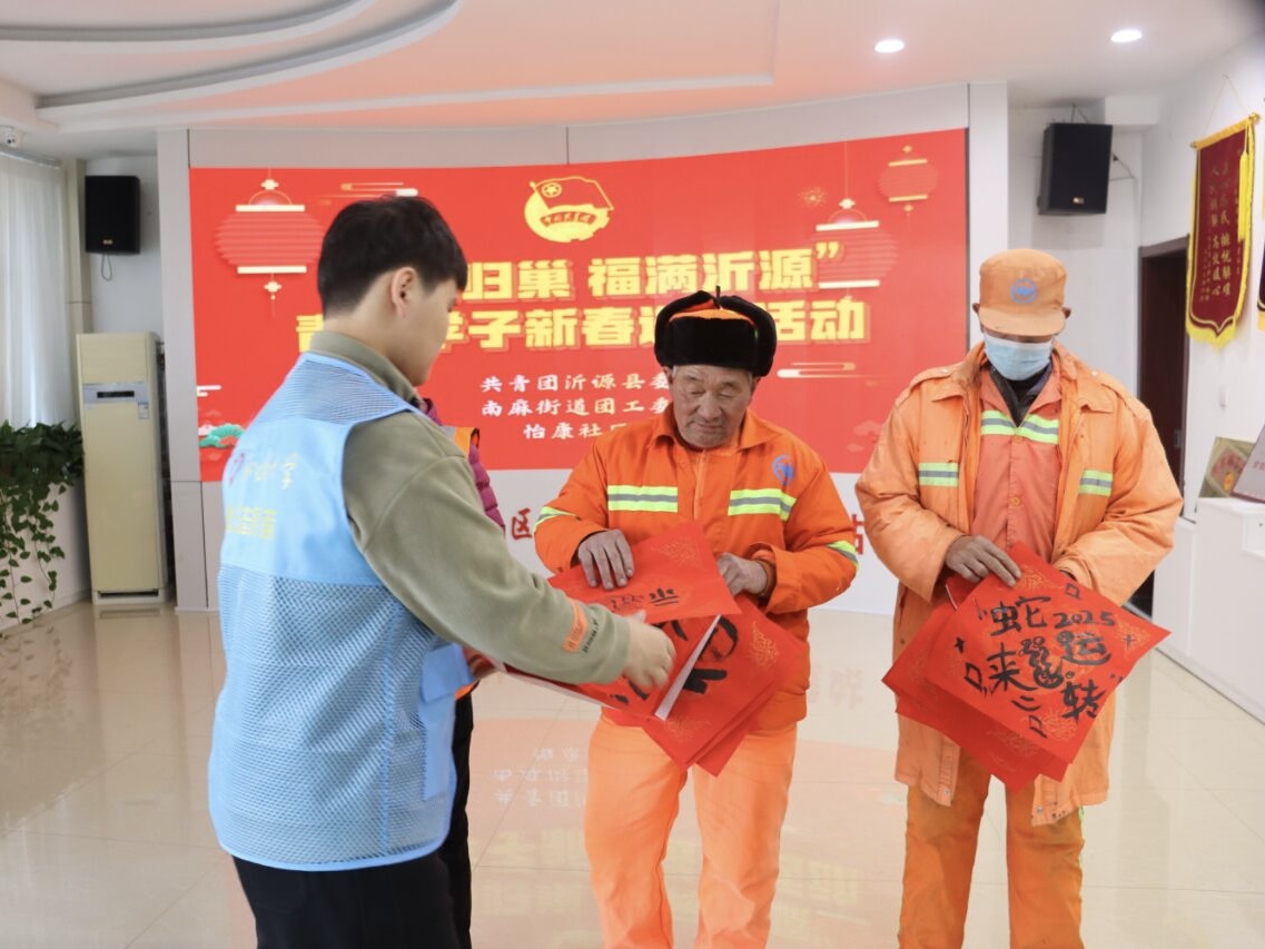 实践队走进社区,开展了一场别开生面的文化讲座,通过讲解PPT和观看视频,将临沭柳编从选材、编织手法到蕴含的民俗寓意,全方位呈现给居民。在送福活动中,他们用毛笔在红纸上写福字和对联供居民领取,居民们脸上洋溢着幸福的笑容。此外,成员们为社区老人打扫卫生、张贴春联,陪他们聊天,听他们讲述过去的故事,让这些老人们感受到社会的关爱和节日的温暖。