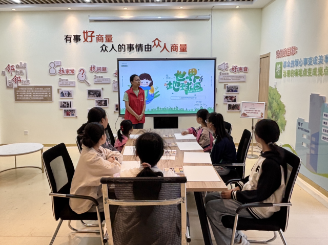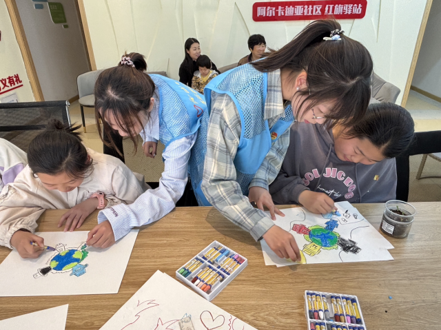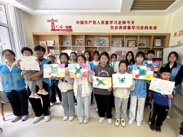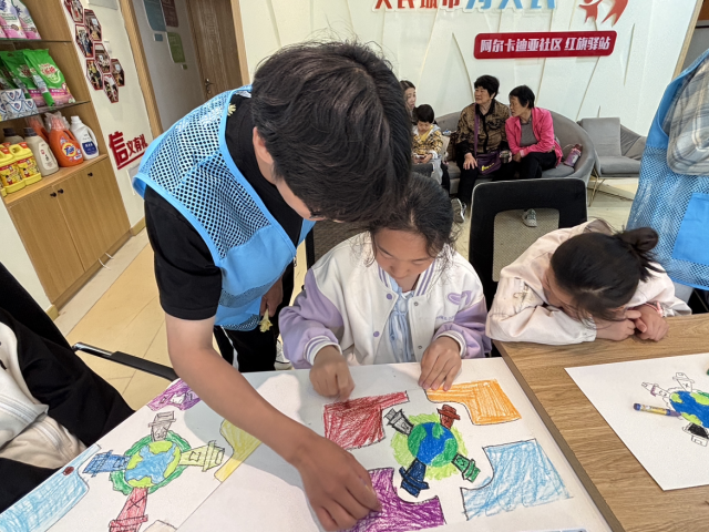 此次活动分为播放环保短片、讲解环保知识、绘画绿色环保图景三个环节。在播放环保短片环节,志愿者通过宣传环保的短片呈现森林砍伐、垃圾污染等破坏环境的场景,以及绿色出行、垃圾分类等环保行动的实例,让孩子们直观认识到环境问题的严峻与环保行动的必要;在讲解环保知识环节,志愿者使用PPT向孩子们介绍世界地球日的由来,讲解了环境污染对海洋生物以及人类生活带来的伤害,在互动问答中引导孩子们从小事做起、不乱丢垃圾、减少使用一次性物品、节约资源等,为保护我们的地球家园贡献一份自己的力量;在绘画环节,孩子们手持彩笔,凭借他们的独特视角与丰富想象,勾勒出心中地球的美丽模样,用创意为环保注入了新的活力,志愿者在旁悉心指导,解答孩子们的疑问,鼓励他们大胆表达自己关于环保的想法。