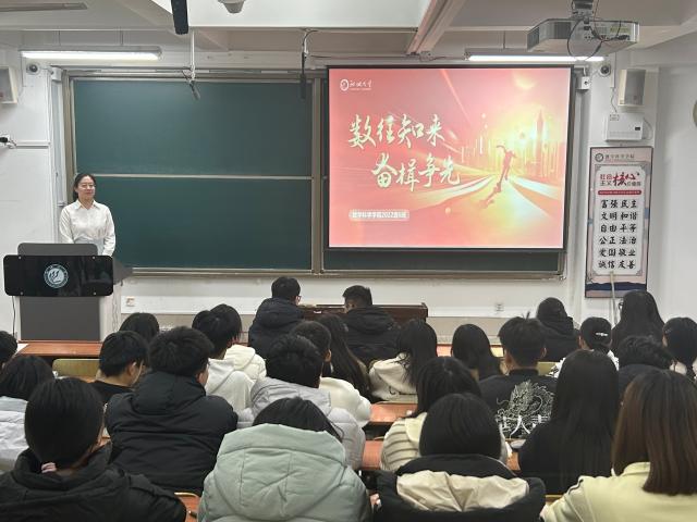 活动伊始,张轩晨从思想引领、学风建设、学科竞赛、社会实践、志愿服务和文体活动六个方面展示先进班集体在本学年中取得的成果。她表示班级始终坚持“班团一体化”建设,以“青年思想价值引领”为核心,统筹团支部、班委会一体化运行,促进以团支部为核心的班团集体建设,同时强调学风建设是一项系统性、持续性工程,各班班委要以主人翁意识肩负起使命与责任,以身作则、全心全意服务同学,调动班级积极性与主动性,增强班级凝聚力,树立良好班风,使优良学风为学生成长成才赋能,为学院高质量人才培养和持续发展蓄势。活动最后,张轩晨鼓励同学们发挥带头作用,重视班级学风建设,强化班级管理,争创先进集体。