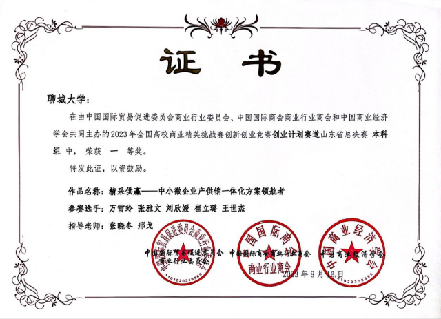 2023年8月 全国高校商业精英挑战赛创新创业计划赛省级一等奖