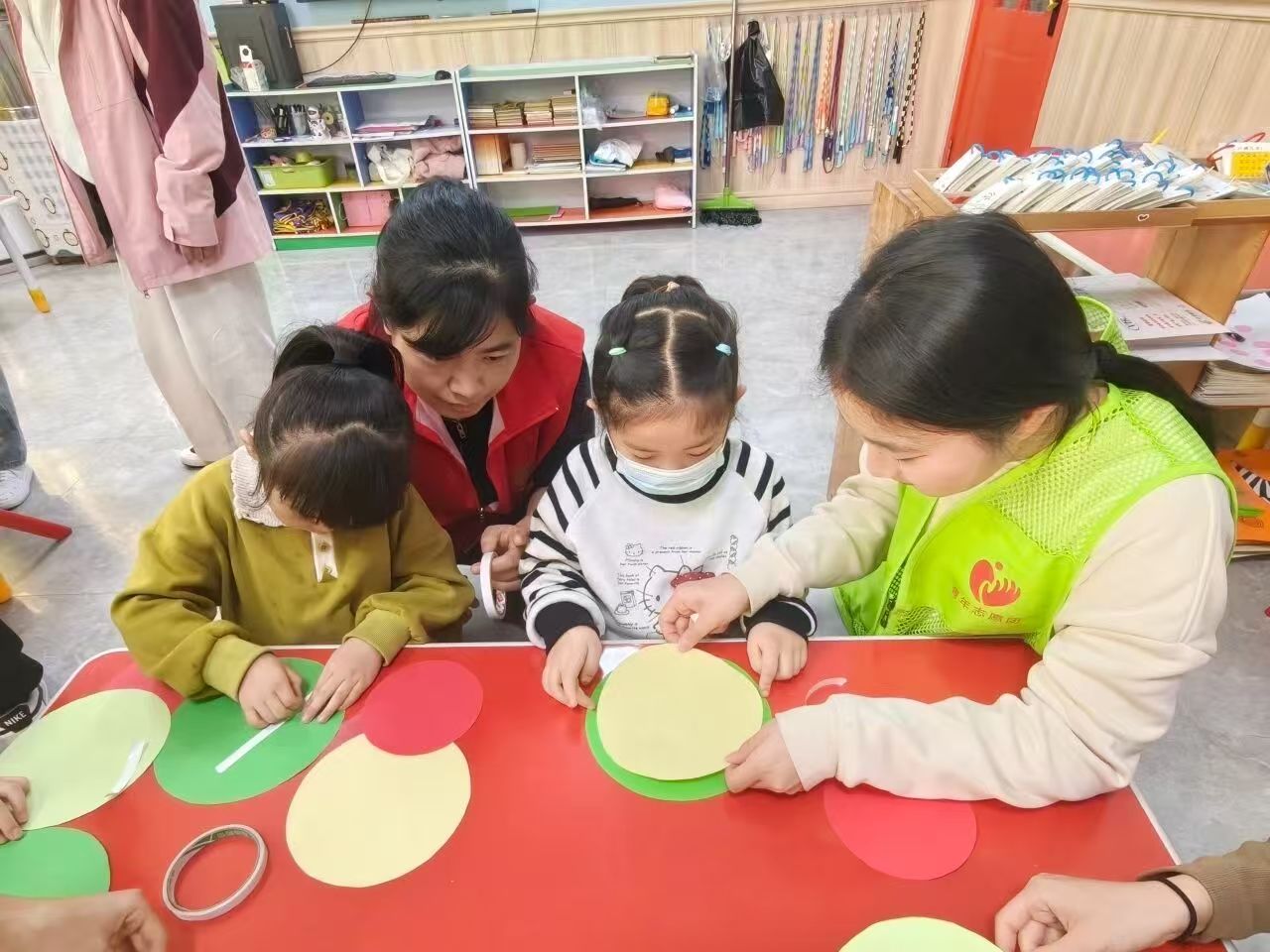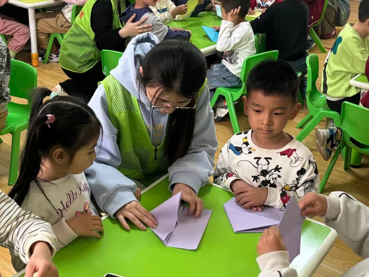 这张照片展现了青年志愿者与社区工作者携手开展幼儿手工公益课堂的温暖瞬间:身着绿马甲的青年志愿者与穿红马甲的社区工作者,耐心陪伴孩子们进行创意手工制作。既展现了志愿者与社区工作者守护幼儿成长的暖心担当,也传递出“寓教于乐、陪伴成长”的公益温度。
