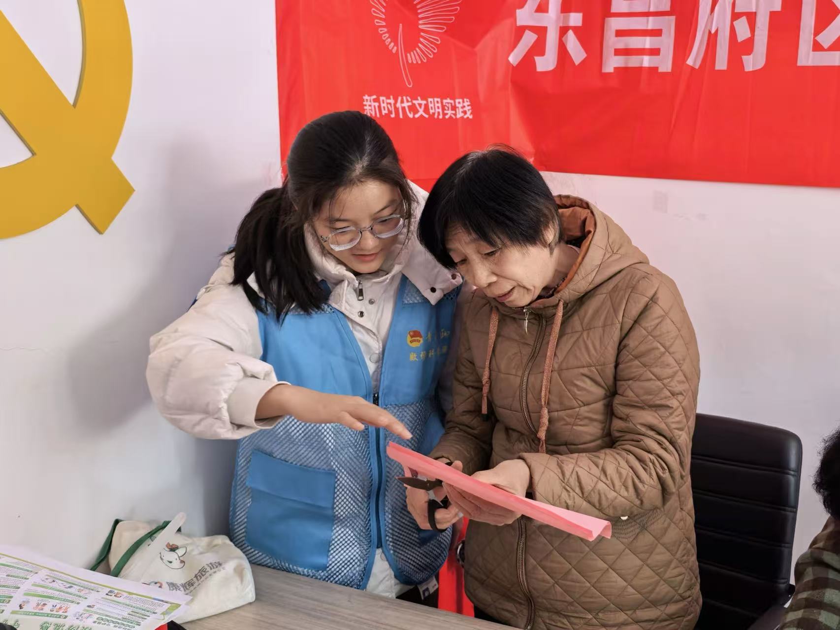 身着蓝马甲的青年志愿者正俯身耐心指导社区老人进行手工剪纸,细致讲解操作要领;老人手持剪刀专注聆听,认真跟随步骤实践。这充分展现了青年志愿者传承非遗文化、服务社区群众的责任担当,也传递出“老少互助、以艺传情”的温情。
