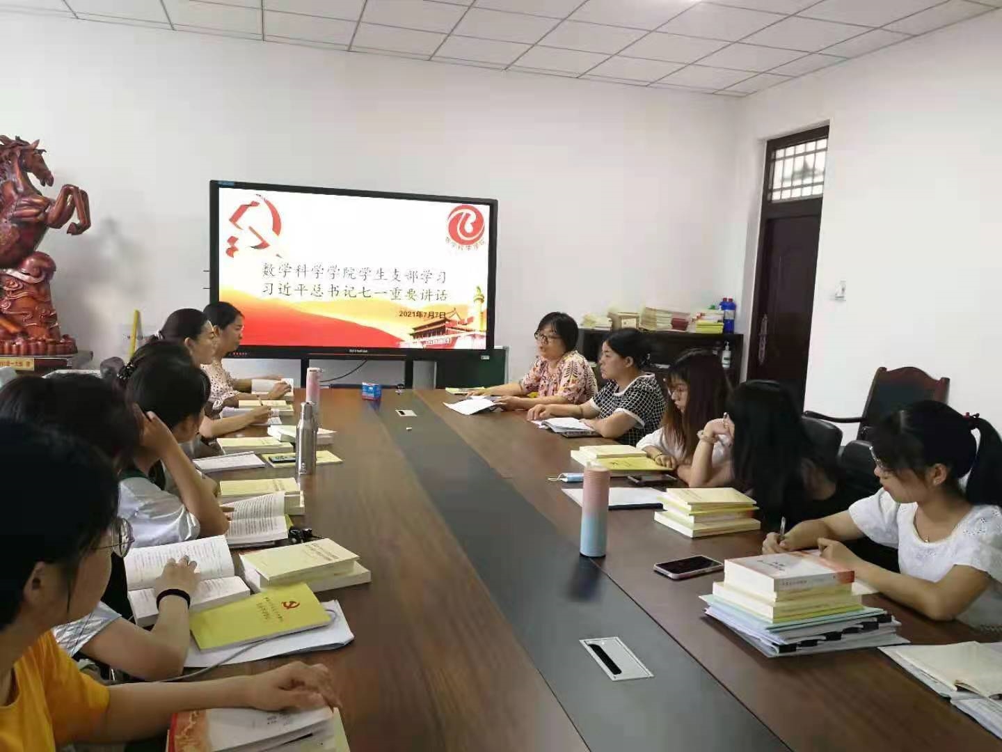 7月7日下午,学院学生党支部书记张晓冬、支部委员范海燕、孙云霞与支部全体学生党员,在11#B301召开学习习近平总书记“七一”重要讲话座谈会。