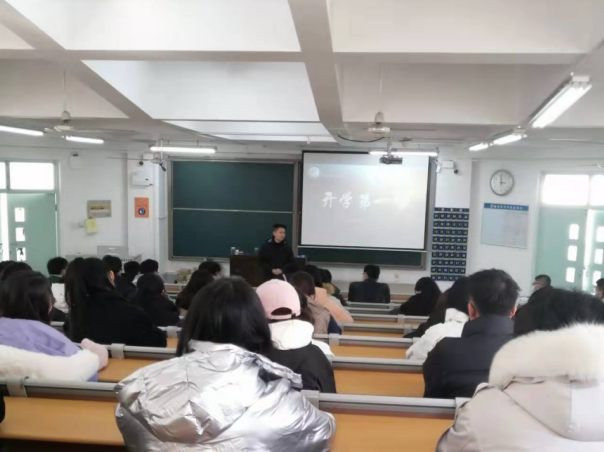 活动伊始,刘学彦总结了上一学期班里的总体情况以及期末成绩,指出了同学们的不足,向大家提出了改进意见及新学期的学习目标。随后,张进军从“疫情防控和生命安全”、“明确人生目标、做好职业生涯规划”等方面展开本次教育演讲课。    张进军着重强调2月19日、20日来自全国各地的学生返校,要求同学们在校期间要做到戴口罩、勤洗手、多通风,合理饮食,积极参加体育锻炼,养成良好卫生习惯和健康生活方式,遵守学校防疫规定,继续保持疫情防控的警惕性,确保在校安全健康。