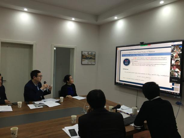 李海涛教授做了题为《Development Status of Semi-tensor Product of Matrices》的报告,介绍了半张量积的发展现状及未来研究方向。冯俊娥教授做了题为《Applications of Semi-tensor Product in Algebra》的报告,介绍了近年来半张量积在代数研究中的理论突破和优秀成果。