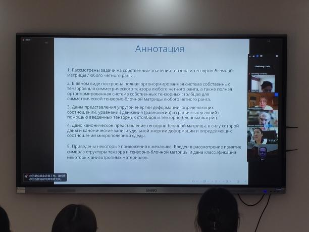 尼卡巴泽教授作了题为《О формулировках и некоторых применениях задач на собственные значения тензорных объектов в механике》的报告,就力学中张量对象特征值问题的公式和应用进行了简要介绍。孔雅耶夫博士作了题为《Nijenhuis geometry and left-symmetric algebras》的报告,并对流行与左对称的、Novikov的和交换的结合代数之间的联系进行了简要分析。