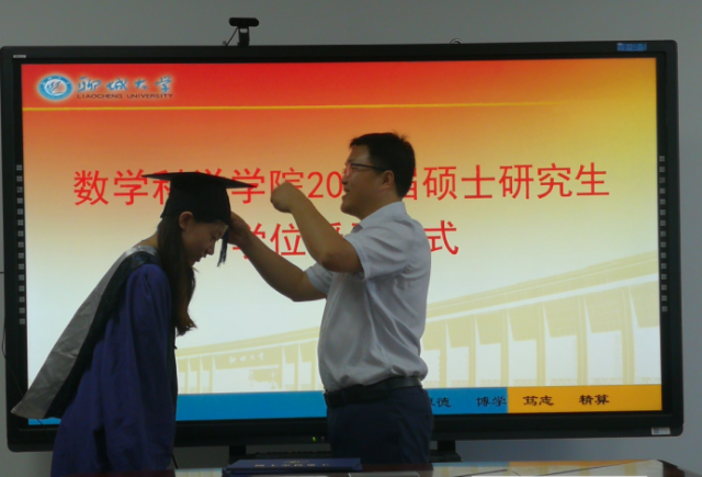 夏建伟为毕业研究生逐个为硕士学位获得者拨穗、颁发学位证书,并一一合影留念。