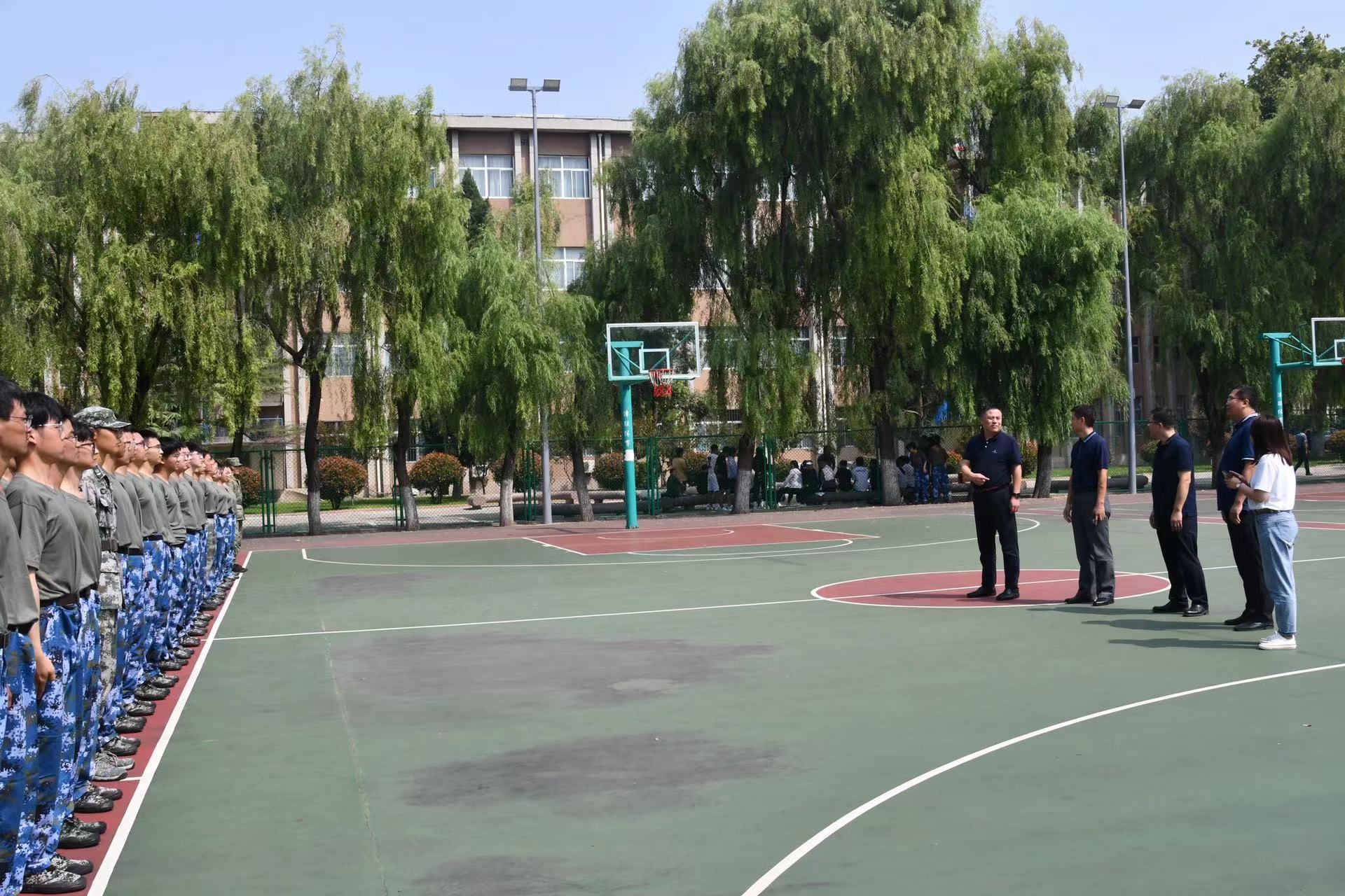 9月5日上午,西校区北篮球场上,口号整齐响亮,步伐铿锵有力,365英国上市2022级新生军训如火如荼地进行着。学院党委书记刘德芳、党委副书记张进军、副院长夏建伟、副院长赵军圣一行来到军训现场,亲切慰问军训教官及全体新生。