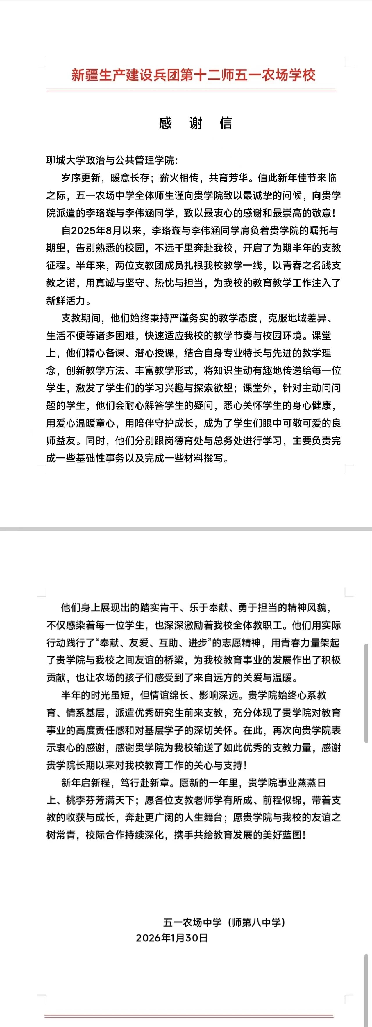 此次收获服务地的广泛赞誉,既是对第27届研支团工作的认可,更是对我校西部计划、研究生支教团工作的肯定。下一步,学校将继续以研究生支教团项目为契机,不断拓展与支教团服务地的深入合作,努力构建“以立德树人为根本,以支教育人为基础,以志愿服务为重点,以协同共建为载体”的校地合作模式,着力将“聊望青年”研支团品牌打造成为聊大学子志愿服务社会、扎根西部基层奉献青春的靓丽旗帜。