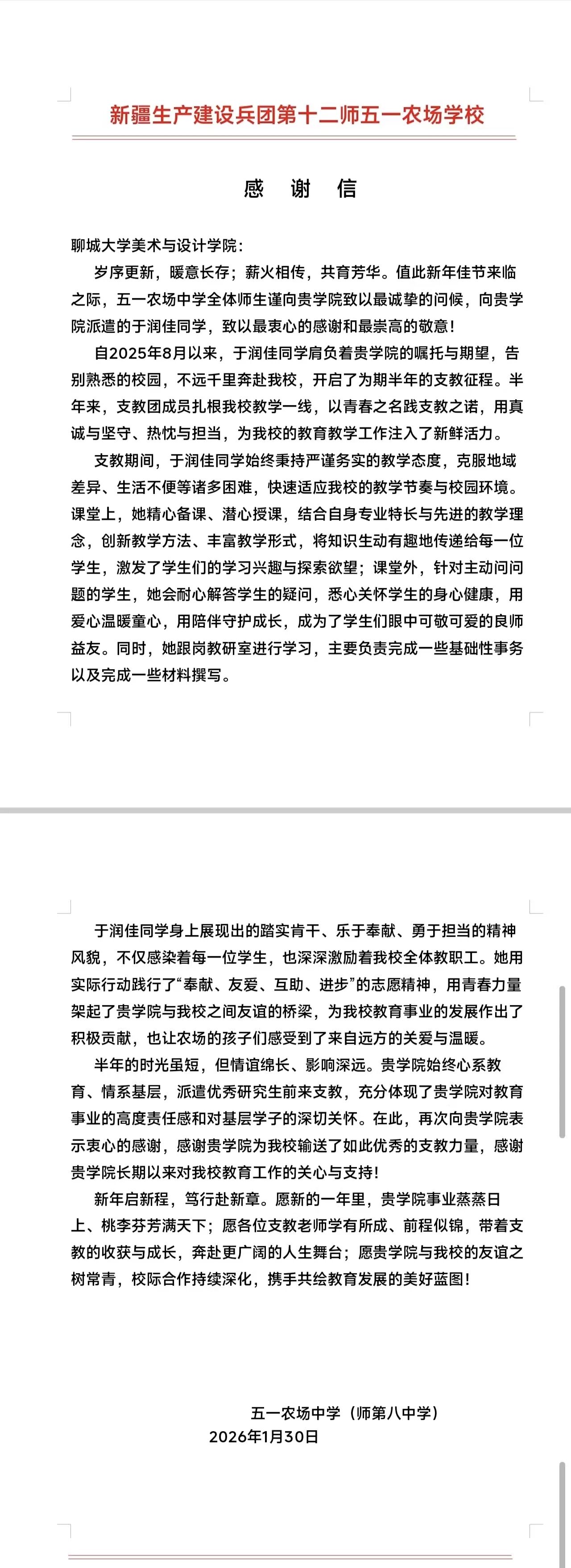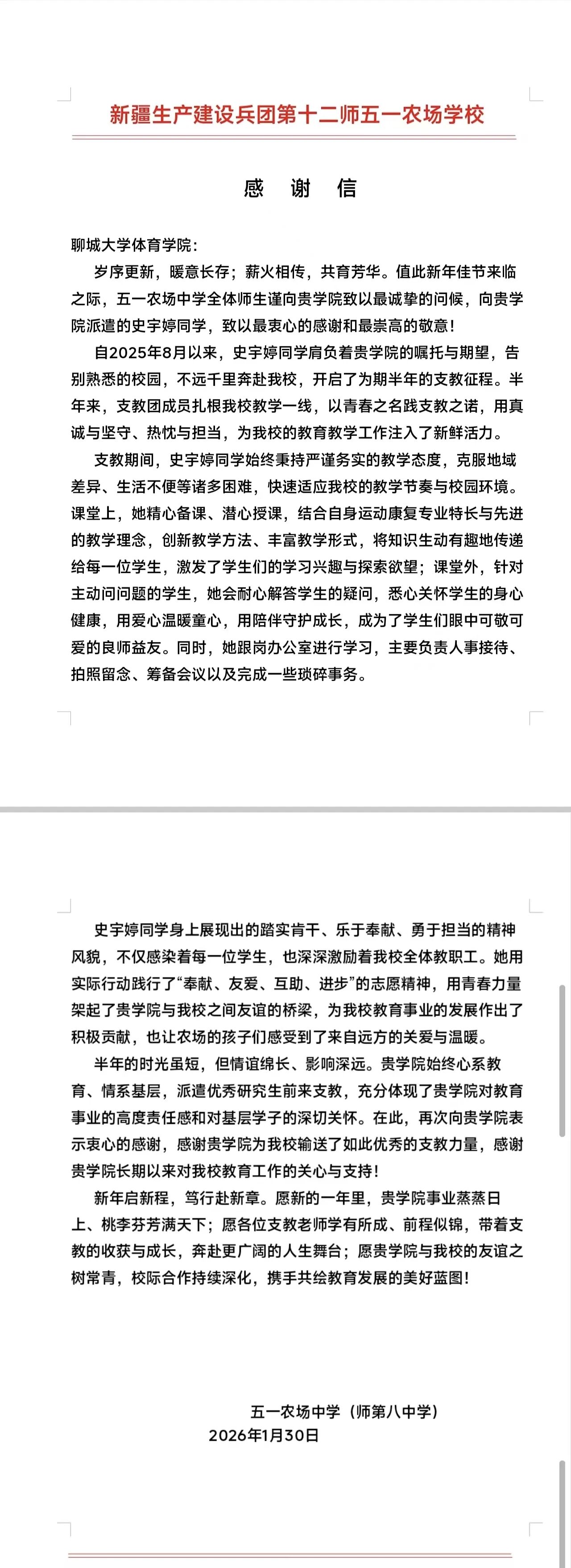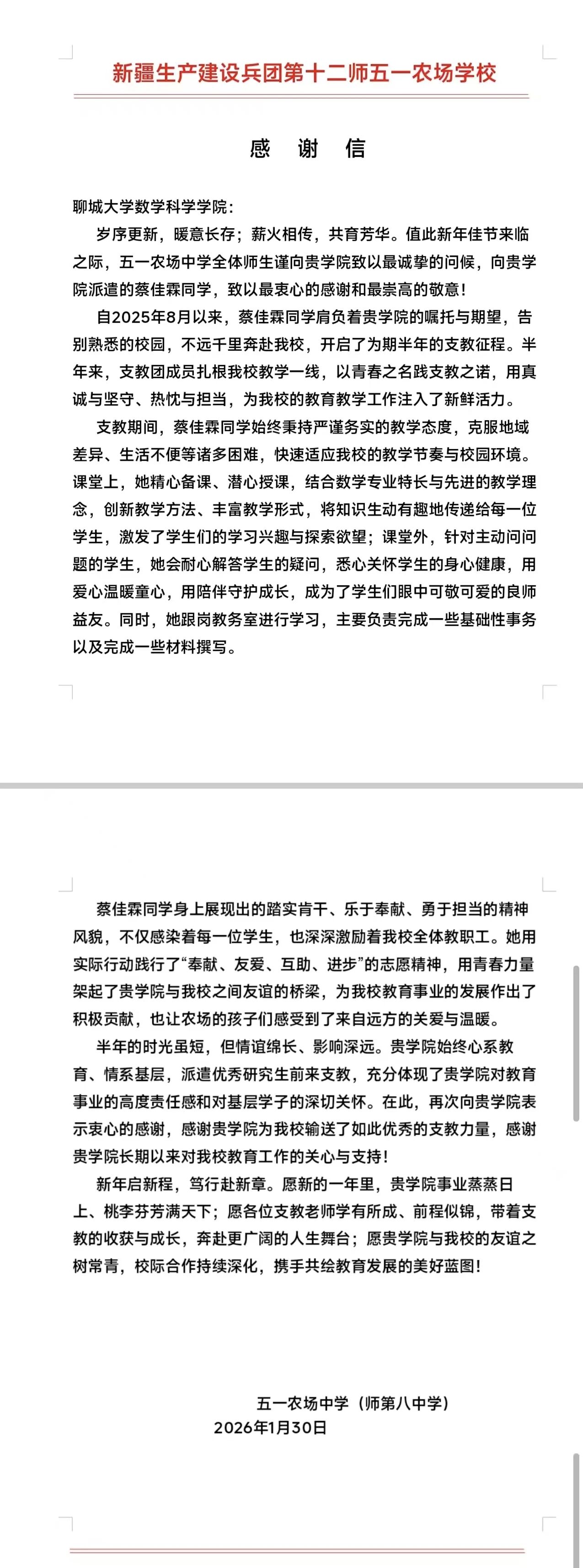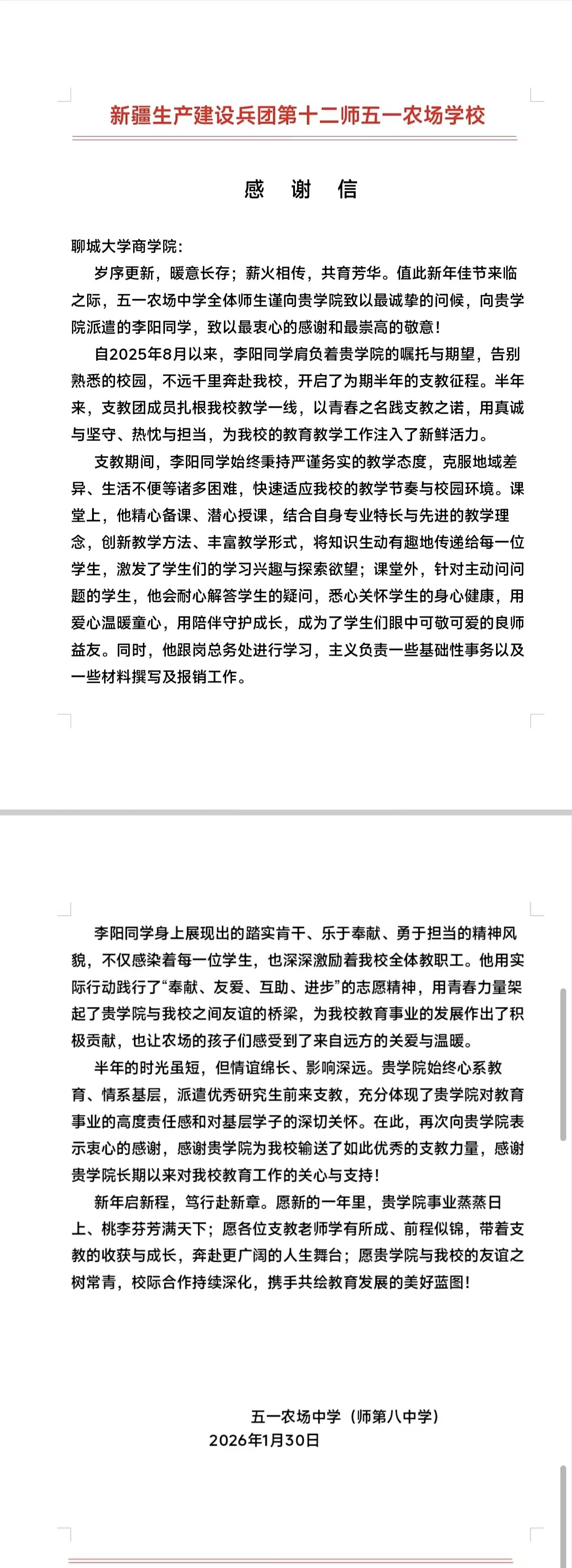英吉沙服务队9名志愿者凭借在援疆支教期间的突出表现,被所在学校授予“优秀支教教师”荣誉称号。一本本鲜红的荣誉证书,不仅是对志愿者们个人辛勤付出的肯定,更是鲁疆情深的生动写照。半年来,英吉沙服务队的志愿者们克服恶劣气候、远离家乡等诸多困难,迅速融入当地教学环境,主动承担毕业班教学任务,创新教学方法,志愿者所带班级学业成绩均显著提升。他们积极参与“青蓝工程”师徒结对,与当地教师互学共进,利用周末时间开展家访,深入学生家庭了解情况,用真情温暖每一个孩子的心田。“这份荣誉属于我们整个团队,更属于所有关心支持援疆事业的聊大人。”手捧证书,志愿者们纷纷表示,将把这段宝贵的支教经历化为前行的动力,继续在各自岗位上发光发热,为促进民族团结、服务西部教育事业发展贡献青春力量。