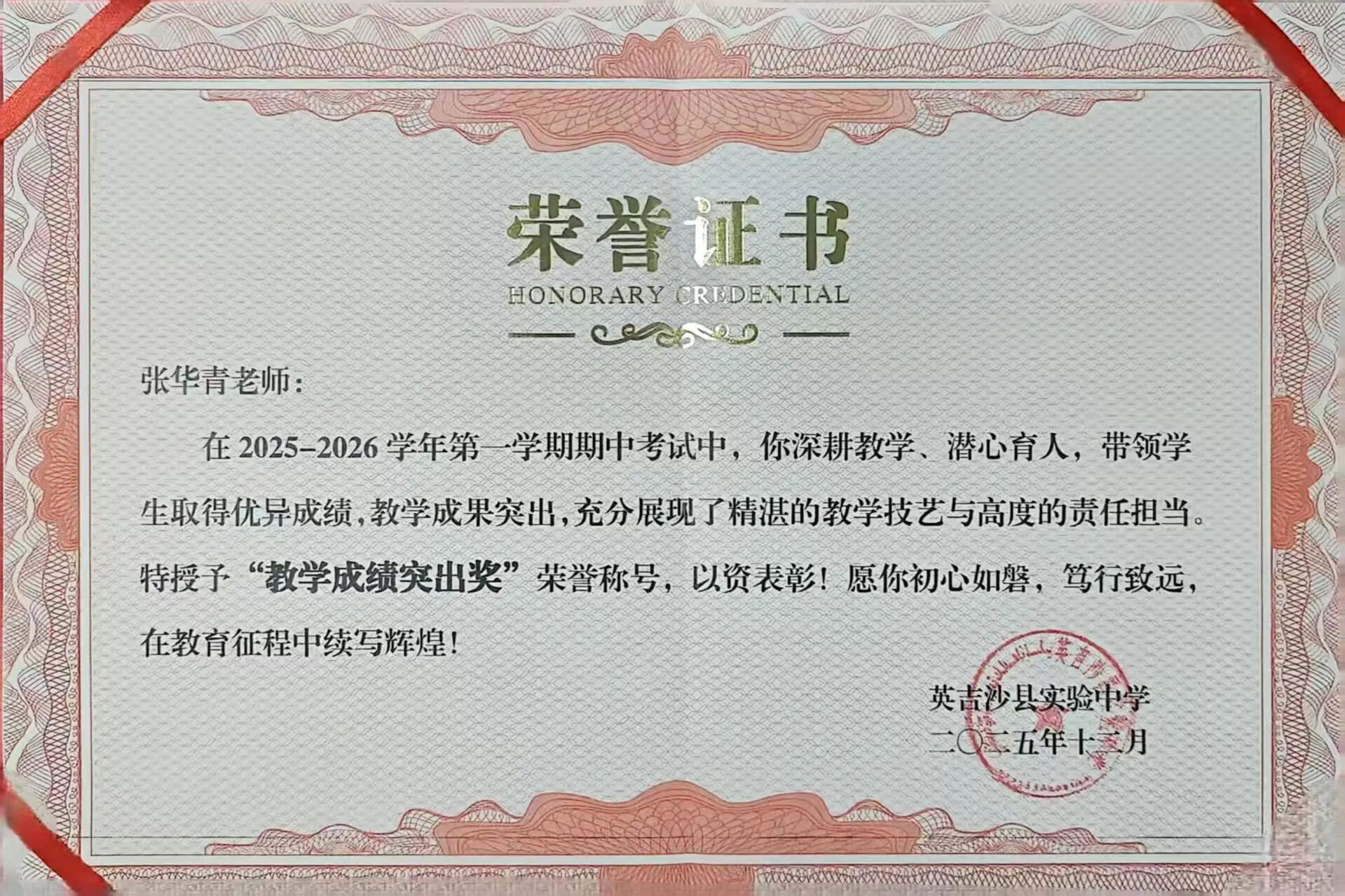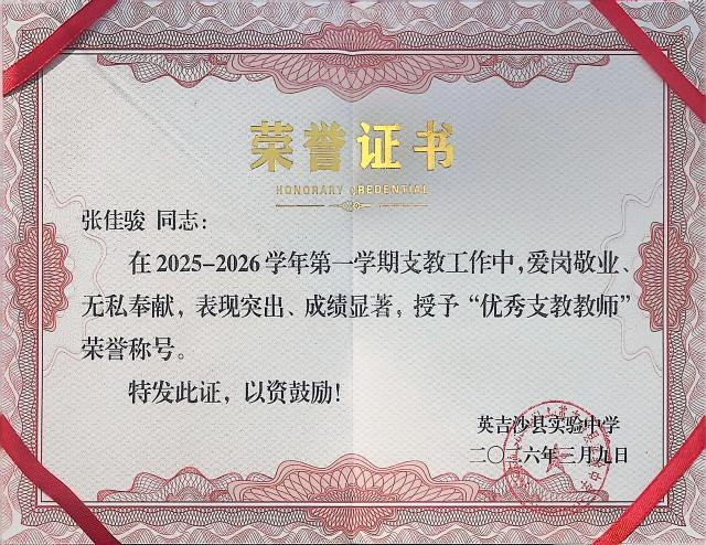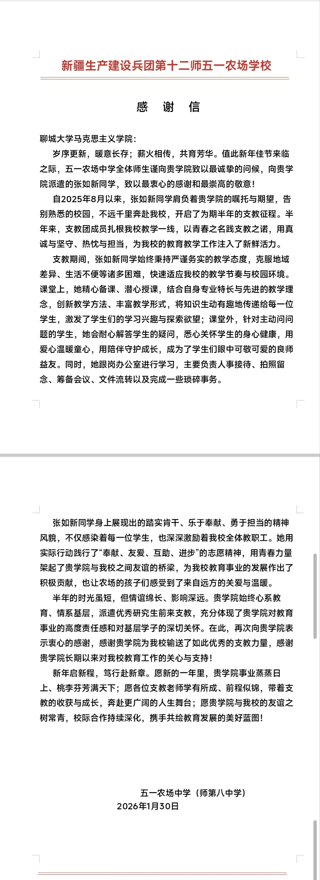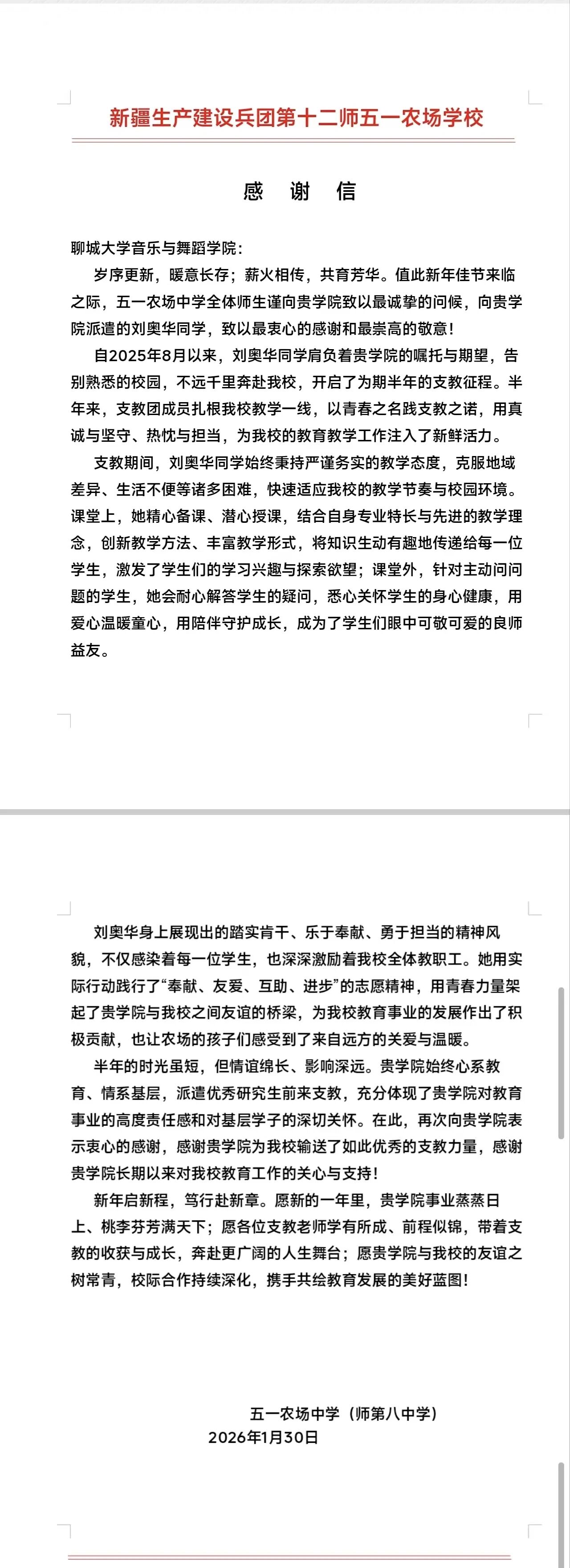 英吉沙服务队9名志愿者凭借在援疆支教期间的突出表现,被所在学校授予“优秀支教教师”荣誉称号。一本本鲜红的荣誉证书,不仅是对志愿者们个人辛勤付出的肯定,更是鲁疆情深的生动写照。半年来,英吉沙服务队的志愿者们克服恶劣气候、远离家乡等诸多困难,迅速融入当地教学环境,主动承担毕业班教学任务,创新教学方法,志愿者所带班级学业成绩均显著提升。他们积极参与“青蓝工程”师徒结对,与当地教师互学共进,利用周末时间开展家访,深入学生家庭了解情况,用真情温暖每一个孩子的心田。“这份荣誉属于我们整个团队,更属于所有关心支持援疆事业的聊大人。”手捧证书,志愿者们纷纷表示,将把这段宝贵的支教经历化为前行的动力,继续在各自岗位上发光发热,为促进民族团结、服务西部教育事业发展贡献青春力量。